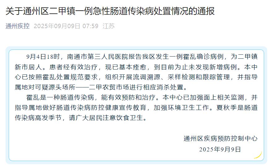 9月4日18时,南通市第三人民医院报告我区发生一例霍乱确诊病例,为二甲镇新市居人。患者经有效治疗,现已基本痊愈,到目前为止未发现新增病例。本中心已按照霍乱处置规范要求,组织开展流调溯源、采样检测和跟踪管理,并指导属地对可疑源头场所——二甲农贸市场进行相应消杀处置。霍乱是一种肠道传染病,能有效预防和治疗。本中心已加强面上相关监测,并指导属地做好肠道传染病防控健康宣传教育,加强环境卫生工作。夏秋季是肠道传染病高发季节,请广大居民注意饮食卫生。